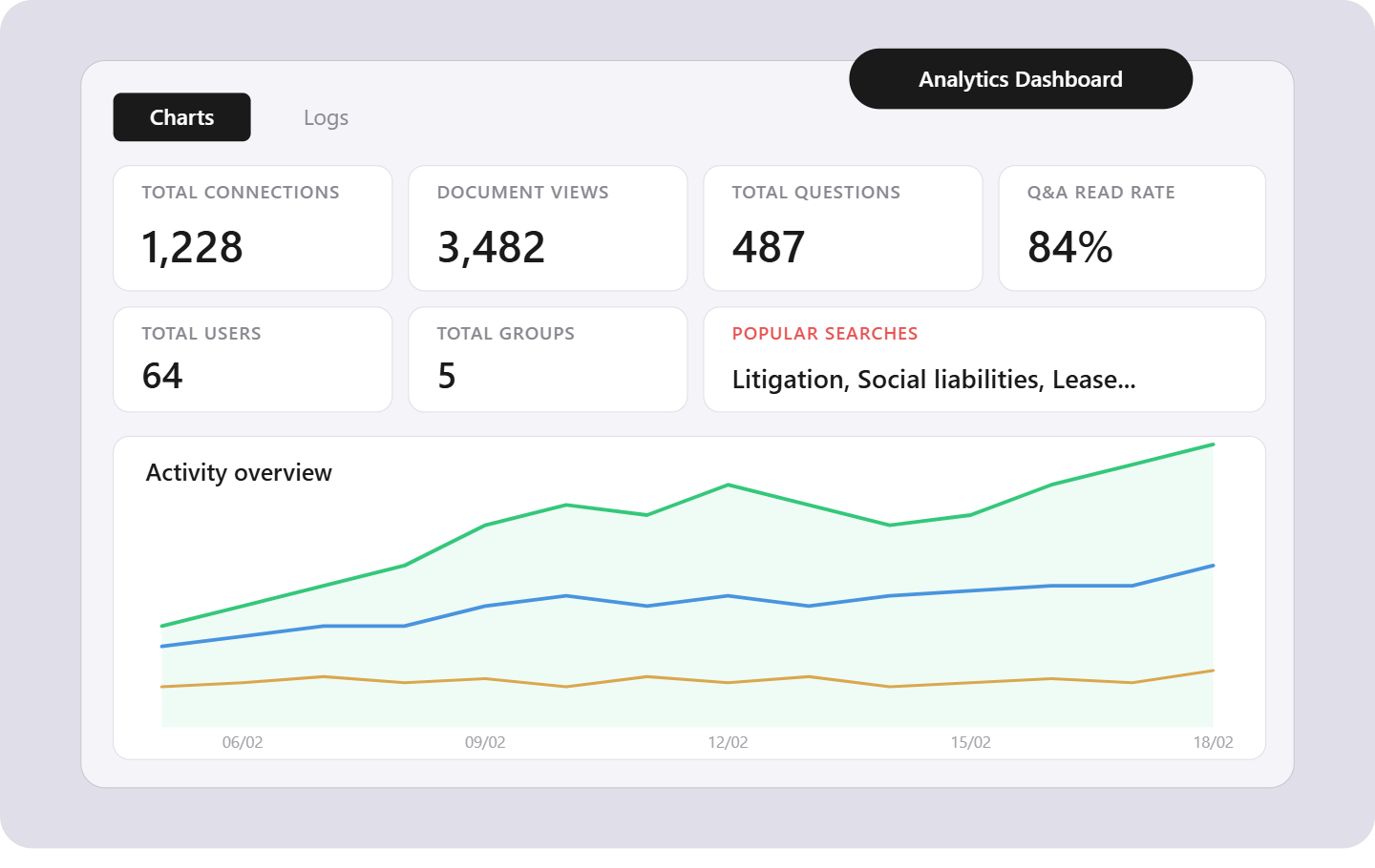 This spring, we are giving sell-side teams the visibility they have always needed: a clear, real-time picture of how buyers are engaging with your data room. Combined with smarter Q&A workflows and tighter access controls, this release is designed to keep your deal moving.