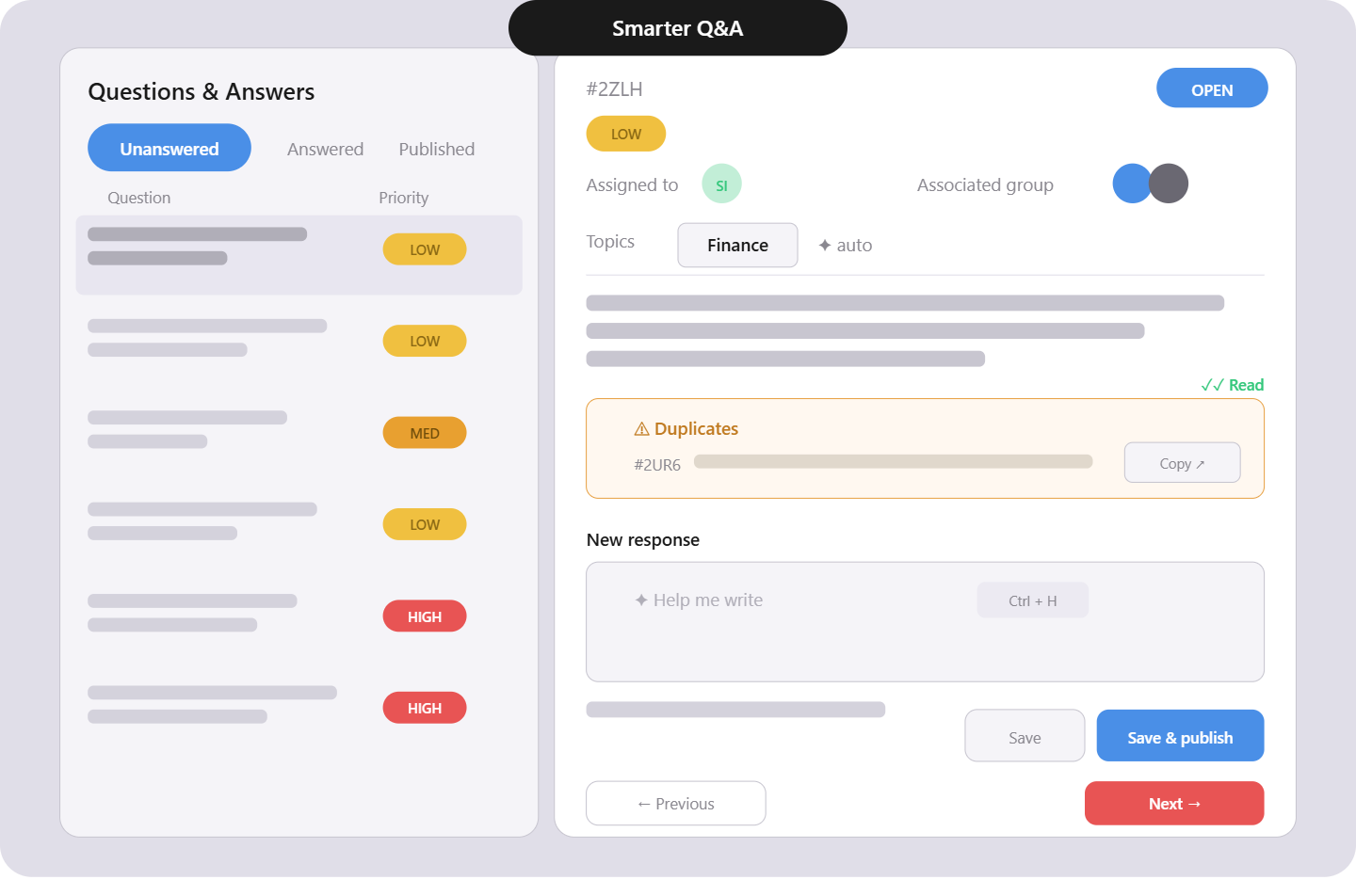 Read receipts now confirm when a buyer has viewed your answer. Duplicate responses can be copied along with their attachments in a single action, and a new "viewed answers" filter helps track which responses still need attention. Sellers now only see questions assigned to them, removing unnecessary noise from their workflow. Topics are auto-assigned by AI when new questions come in, reducing manual triage.