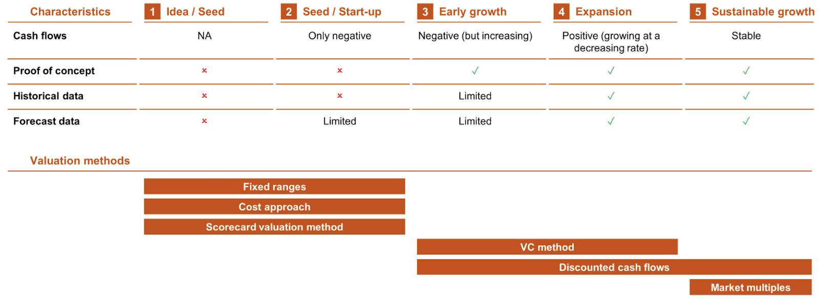 The chosen method of valuation relies on the level of maturity of the target entity: